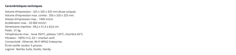 - Chambre activement chauffée à 65°C : réduit les risques de warping et permet l’usage de matériaux avancés et d’extrusion multi-couleur/multi-matériaux.
