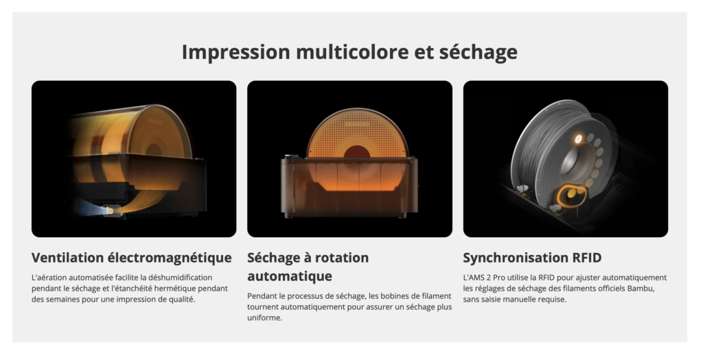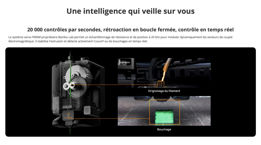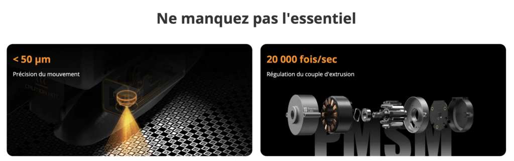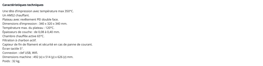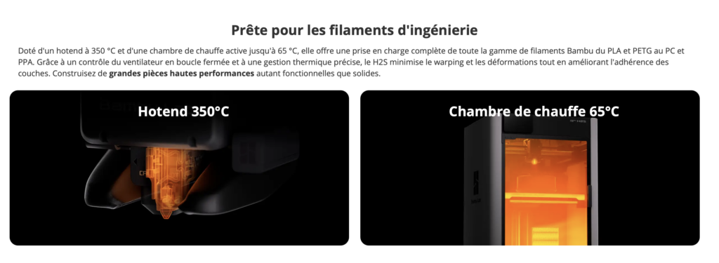 La Bambu Lab H2S Combo est une imprimante 3D grand format qui propose un volume d’impression conséquent de 340 × 320 × 340 mm, permettant de réaliser des objets de taille importante. Elle dispose d’une chambre chauffée dont la température est réglable jusqu’à 65 °C, ce qui favorise une meilleure adhérence des pièces et une qualité d’impression optimale. Son hotend peut atteindre une température maximale de 350 °C, offrant ainsi la possibilité d’imprimer une grande variété de filaments, y compris des matériaux techniques. Cette imprimante est capable d’atteindre une vitesse maximale de 1000 mm/s grâce à son extrudeur ultra-précis, garantissant rapidité et précision. De plus, elle est équipée d’un système AMS2 chauffant, renforçant ses capacités d’impression avancées.