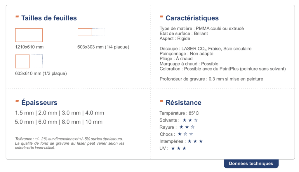 | Épaisseurs | 1,5 mm , 2,0 mm , 3,0 mm , 4,0 mm , 5,0 mm , 6,0 mm , 8,0 mm , 10,0 mm |